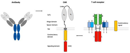 The optimal composition of the CAR is crucial for efficient CART cell-based cancer immunotherapy. CARs contain a scFv of an antibody as an extracellular binding domain for HLA-independent antigen recognition, a transmembrane (TM) domain, and a CD3ζ chain as an intracellular signaling domain [79] (Figure 2). Additional stability of the CAR can be obtained by a non-signaling extracellular spacer domain between the scFv and the TM domain [80]. The length and composition of the spacer domain can influence the CART cell function independently of the intracellular domain [80,81]. The spacer domain often consists of an IgG hinge domain and a CH2-CH3 domain of an IgG-Fc [79].