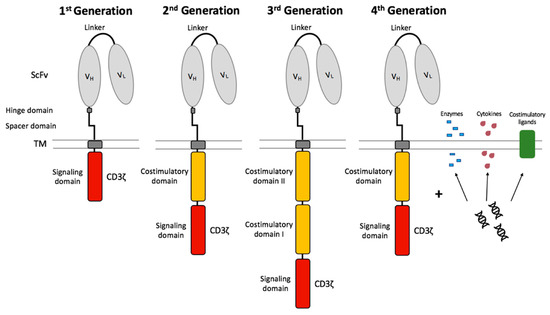 - Van der Stegen, S.J.; Hamieh, M.; Sadelain, M. The pharmacology of second-generation chimeric antigen receptors. Nat. Rev. Drug Discov. 2015, 14, 499–509. [Google Scholar] [CrossRef] [PubMed]