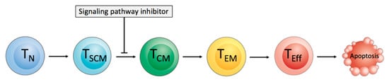 The supplementation of pathway inhibitors during ex vivo T cell expansion might cause an interruption of T cell differentiation by the inhibition of specific signaling pathways, and thus shift the T cell phenotype in the final CART cell product towards a less differentiated phenotype [120]. The possible targets include GSK3β, mTOR, AKT, and PI3K for specific pathway inhibition (Figure 4).