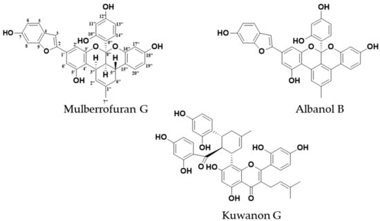 - Wei, H.; Zhu, J.-J.; Liu, X.-Q.; Feng, W.-H.; Wang, Z.-M.; Yan, L.-H. Review of bioactive compounds from root barks of Morus plants (Sang-Bai-Pi) and their pharmacological effects. Cogent Chem. 2016, 2, 1212320. [Google Scholar] [CrossRef]