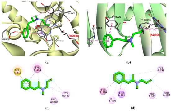 | Selegiline c | −7.06 | Ile198 | Tyr398 (Pi-Pi Stacked), Tyr435 (Pi-Pi Stacked), FAD600 (Pi-Pi T-shaped), Leu171 (Alkyl), Cys172 (Alkyl), Phe188 (Pi-Alkyl) | - |