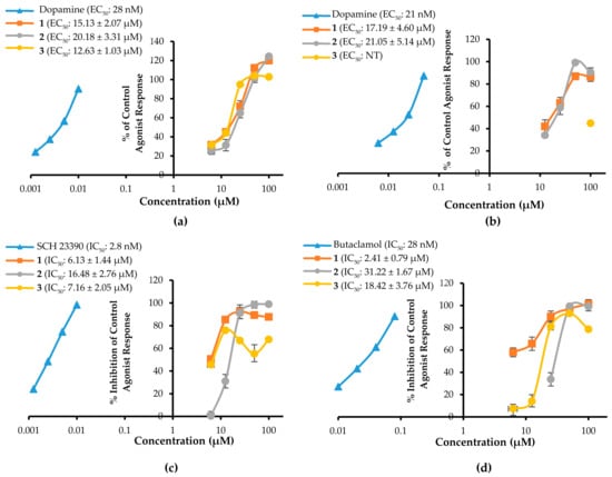 | % Stimulation a (% Inhibition b) | % Stimulation a (% Inhibition b) | % Stimulation a (% Inhibition b) | EC50 c (IC50 d) | |