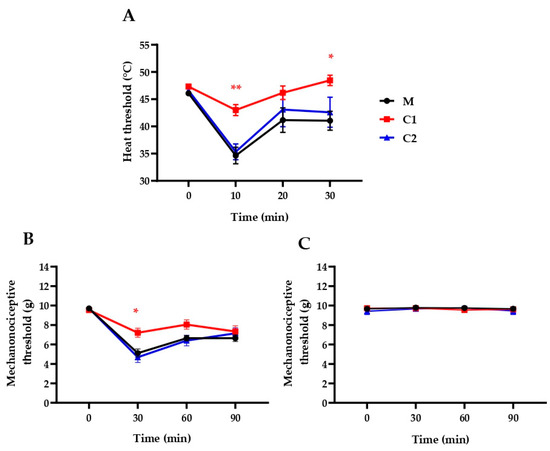 2.3. C1 Compound Decreases RTX-Induced Inflammatory Thermal Allodynia and Mechanical Hyperalgesia