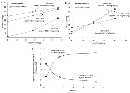 - the average PO2 of PTC’s (white circles) adjusts almost exactly to PTC feed (Hb saturation at 75%), within 0.5–1.0 mmHg, in ~5 ms;