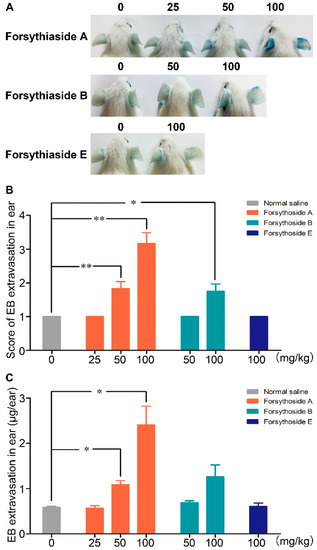 Forsythoside A and forsythoside B induce vascular leakage in mice. (A) Vascular leakage in mice injected with forsythoside A/Evans blue (EB), forsythoside B/EB, or forsythoside E/EB. (B) The score of blue stain in the ears of mice injected with forsythoside A/EB, forsythoside B/EB, or forsythoside E/EB (n = 6). (C) Quantification of the EB extracted from the ears of mice injected with forsythoside A/EB, forsythoside B/EB, or forsythoside E/EB (n = 6). The same vehicle control group (normal saline) was used for forsythoside A, forsythoside B, and forsythoside E. * p < 0.05, ** p < 0.01 compared with the normal saline-treated group.