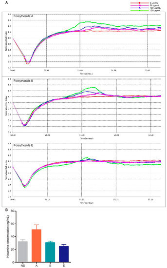 Forsythoside A and forsythoside B slightly evoke mast cell degranulation. (A) Cell index of the mast cells incubated with forsythoside A, forsythoside B, or forsythoside E. (B) Histamine concentration in the plasma of mice treated with forsythoside A, forsythoside B, and forsythoside E (n = 10). (NS: mice treated with normal saline, A: mice treated with forsythoside A, B: mice treated with forsythoside B, E: mice treated with forsythoside E).