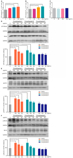 Forsythoside A and forsythoside B alter the endothelial monolayer permeability and expression of GTP-RhoA, p-MYPT1, and p-MLC2 in human umbilical vein endothelial cells (HUVECs). (A) Fluorescence apparent permeability coefficient of FITC-dextran through a monolayer of confluent HUVECs incubated with forsythoside A (n = 3). (B) Fluorescence apparent permeability coefficient of FITC-dextran through a monolayer of confluent HUVECs incubated with forsythoside B (n = 3). (C) Fluorescence apparent permeability coefficient of FITC-dextran through a monolayer of confluent HUVECs incubated with forsythoside E (n = 3). (D) Western analysis of GTP-RhoA in HUVECs incubated with forsythoside A, forsythoside B, and forsythoside E (n = 3). (E) Western analysis of p-MYPT1 in HUVECs incubated with forsythoside A, forsythoside B, and forsythoside E (n = 3). (F) Western analysis of p-MLC2 in HUVECs incubated with forsythoside A, forsythoside B, and forsythoside E (n = 3). The same GAPDH was used for p-MYPT1 and p-MLC2, and the same GAPDH was used for MYPT1 and MLC2, respectively. * p < 0.05, ** p < 0.01 compared with the DMEM-treated group.