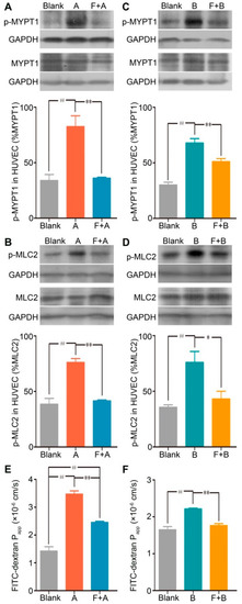 Fasudil hydrochloride suppresses forsythoside A/forsythoside B-induced increased expression of p-MYPT1 and p-MLC2, and it enhances endothelial permeability in HUVECs. (A) Western analysis of p-MYPT1 in HUVECs incubated with forsythoside A, with or without fasudil (n = 3). (B) Western analysis of p-MLC2 in HUVECs incubated with forsythoside A, with or without fasudil (n = 3). (C) Western analysis of p-MYPT1 in HUVECs incubated with forsythoside B, with or without fasudil (n = 3). (D) Western analysis of p-MLC2 in HUVECs incubated with forsythoside B, with or without fasudil (n = 3). (E) Fluorescence apparent permeability coefficient of FITC-dextran through a monolayer of confluent HUVECs incubated with forsythoside A, with or without fasudil (n = 3). (F) Fluorescence apparent permeability coefficient of FITC-dextran through a monolayer of confluent HUVECs incubated with forsythoside B, with or without fasudil (n = 3). * p < 0.05, ** p < 0.01 compared with the forsythoside A/forsythoside B-treated group. # p < 0.05, ## p < 0.01 compared with the DMEM-treated group. (Blank: cells treated with culture medium of DMEM, F: cells pretreated with fasudil hydrochloride, A: cells treated with forsythoside A, B: cells treated with forsythoside B).