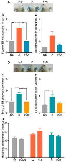 Fasudil hydrochloride inhibits forsythoside A/forsythoside B-induced vascular leakage in mice. (A) Vascular leakage in mice injected with forsythoside A, with or without fasudil. (B) The score of blue stain in the ears of mice injected with forsythoside A, with or without fasudil (n = 6). (C) Quantification of the EB extracted from the ears of mice injected with forsythoside A, with or without fasudil (n = 6). (D) Vascular leakage in mice injected with forsythoside B, with or without fasudil. (E) The score of blue stain in the ears of mice injected with forsythoside B, with or without fasudil (n = 6). (F) Quantification of the EB extracted from the ears of mice injected with forsythoside B, with or without fasudil (n = 6). (G) Histamine concentration in the plasma of mice treated with forsythoside A and forsythoside B, with or without fasudil (n = 10). The same vehicle control group (normal saline) was used for both forsythoside A and forsythoside B. * p < 0.05, ** p < 0.01 compared with the forsythoside A/forsythoside B-treated group. # p < 0.05, ## p < 0.01 compared with the normal saline-treated group. (NS: mice treated with normal saline, F: mice pretreated with fasudil hydrochloride, A: mice treated with forsythoside A, B: mice treated with forsythoside B).