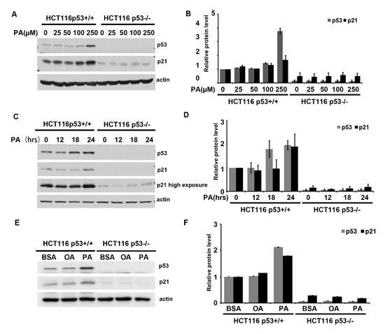 Palmitic acid is a saturated free fatty acid that builds up in non-adipose cells, leading to cell liopotoxicity effects such as apoptosis and disease onset [30]. For example, palmitic acid can induce pancreatic β-cell dysfunction, resulting in insulin resistance and diabetes [6,30,31], and cardiac myocyte apoptosis, leading to heart failure [13,32]. p53 is a tumor suppressor, which is often viewed as a cellular guardian that protects cells from damage [33,34]. In order to investigate p53′s role in palmitic acid-induced lipotoxicity, a complex of palmitic acid and albumin with defined ratio was used to mimic saturated free fatty acids under physiological conditions. Although the normal physiological ratio of fatty acid to albumin is about 2:1, a ratio of 8:1 palmitic acid:bovine serum albumin (BSA) complex (hereafter abbreviated as PA) was used in this experimental system [1]. HCT116 p53+/+ and HCT116 p53−/− cell lines were separately complemented with 0, 50, 100, or 250 µM PA or BSA for 24 h. p53 was mildly activated by PA in the HCT116 p53+/+ cell line in a dose- and time-dependent manner (Figure 1A,C). Expression levels of the important p53 target gene, p21 (cyclin-dependent kinase inhibitor 1), also increased significantly after PA treatment (Figure 1A,C). Levels of p21 protein increased by approximately 2-fold relative to the BSA control in HCT116 p53+/+ cells (Figure 1B,D). Interestingly, oleic acid complexed with BSA in an 8:1 ratio (hereafter abbreviated as OA) did not activate p53 as PA did (Figure 1E,F). These results demonstrate that p53 was specifically induced by PA. Palmitic acid activates p53 in a dose- and time-dependent manner and may play an important role in lipotoxicity induced by PA.