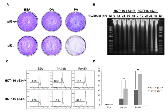 To further investigate p53′s role in PA treatment, HCT116 p53+/+ and HCT116 p53−/− cells were treated with different PA doses and incubated with PA for various time periods. First, we observed that HCT116 p53−/− cells became rounder and gradually broke away from the plate faster than HCT116 p53+/+ cells. To further observe the long-term effects of PA treatment, we seeded HCT116 p53+/+ and p53−/− cells into 6-well plates at (4 × 104) 5% confluence. After 24 h, we separately treated cells with 250 µM PA or 250 µM OA for 48 h in the wells. Crystal violet staining was then performed to visualize all cells that remained adherent to the plate under these conditions. PA treatment clearly resulted in a decrease in cell number per plate, which could reflect proliferation arrest and apoptosis, while OA treatment was ineffective (Figure 2A). To verify whether the PA effect was associated with apoptosis, we collected and extracted genomic DNA from the cells that were treated with 250 µM PA for 0–48 h. As an apoptotic cell marker, DNA laddering was observed in the gel (Figure 2B). We also extracted small fragments of apoptotic DNA, like previous results, more cell apoptosis occurred in HCT116 p53−/− cells than in HCT116 p53+/+ cells under the same experimental conditions. Apoptotic cell was also dependent on PA treatment time (Figure S1). To quantify apoptotic cell, Sub-G1 cells were measured using flow cytometry after propidium iodide staining. After 48 h of PA treatment, the amount of apoptosis in HCT116 p53−/− cells was more than 2-fold greater than that in HCT116 p53+/+ cells (15.5% vs. 31.1%) (Figure 2C,D). These results show that p53 may be required for cell survival under PA treatment and that knocking out of p53 leads to more apoptosis in the HCT116 cell line.