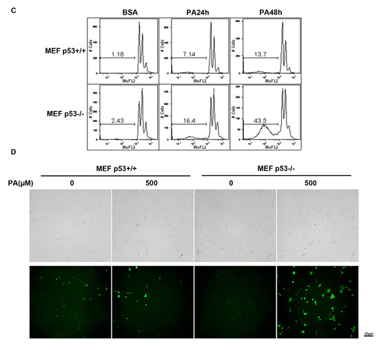 It has already been shown that several cell types undergo apoptosis in response to palmitic acid treatment, including pancreatic β-cells [10,11], breast cancer cell lines [12], cardiac myocytes [13], vascular smooth muscle cells [14], hepatic cells [15], and neural stem cells [16]. These apoptotic systems are associated with various diseases. For example, pancreatic β-cell dysfunction leads to insulin secretion resistance which in turn causes hyperglycemia and diabetes. Likewise, apoptosis of cardiac myocytes results in heart failure. Here, more apoptosis occurred in MEF p53−/− cells compared with MEF p53+/+ cells, which is important because the absence of p53 may contribute to various apoptosis-related diseases. Our results suggest that p53 can potentially promote cell survival under PA treatment. Consistent with the known functions of p53, p53 protects cells against DNA damage under low-level cellular stress in normal cells [34].