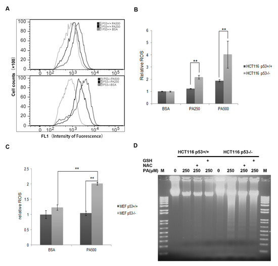 Accumulation of ROS in cells treated with PA is known to be a contributing factor in PA-induced lipotoxicity [37,38,39,40]. Therefore, we used H2DCFDA to test whether p53-mediated anti-apoptosis was associated with a decrease in ROS. DCFDA diffuses into cells, where it is deacetylated to DCF, which in turn fluoresces upon reaction with a variety of ROS [41]. ROS was measured in HCT116 p53−/− and p53+/+ cells treated with 250 or 500 µM PA for 24 h. As Figure 4A,B shows, ROS accumulated more in HCT116 p53−/− cells than in HCT116 p53+/+ cells. ROS increased almost 4-fold compared with BSA controls in HCT116 p53−/− cells from the PA500 treatment group; however, ROS increased only 2-fold compared with BSA controls in HCT116 p53+/+ cells from the same treatment group (Figure 4A,B). Similarly, we measured ROS levels in MEF cells treated with PA500; ROS increased 2-fold in MEF p53−/− cells but increased only slightly in MEF p53+/+ cells (Figure 4C). Treatment for 24 h with PA and the ROS scavengers N-acetyl-cysteine (NAC) or glutathione (GSH) decreased DNA laddering observed in MEF p53−/− cells but not MEF p53+/+ cells, suggesting that NAC and GSH partially reduced PA-induced apoptosis in MEF p53−/− cells (Figure 4D). These results showed that ROS play an important role in apoptosis and that HCT116 and MEF cells are at least partly dependent on p53 to eliminate ROS production in response to PA treatment.