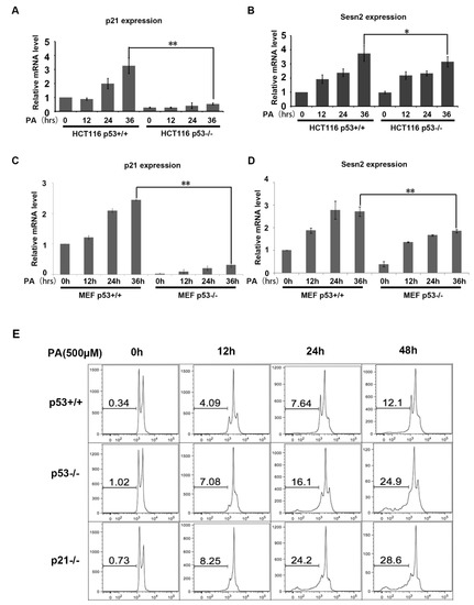 To study potential mechanisms of PA stress, we examined the expression of two key genes induced by p53: p21 and Sesn2. p21 expression has been widely investigated in response to different stresses. HCT116 cells and MEF cells were treated with 250 μM PA for different time periods. Real-time fluorescence quantitative PCR was performed to measure the expression of p21. p21 expression was induced 2- to 3-fold higher by PA in p53 wild type cells (Figure 5A,C). Sesn2 plays an important role in maintaining redox and metabolic homeostasis, previous studies have reported that Sesn2 is involved in antioxidant processes as a downstream target of p53. We measured the expression of Sesn2 in response to PA treatment of p53+/+ and p53−/− cell lines. After 36 h of PA treatment, Sesn2 expression increased more than 3-fold in HCT116 p53+/+ cells but only 2.8-fold in HCT116 p53−/− cells. Similarly, Sesn2 expression increased more than 2.5-fold in MEF p53+/+ cells but only 1.6-fold in MEF p53−/− cells after 36 h of PA treatment (Figure 5B,D). In order to further investigate the effect of p21 under PA stress, we detected cell apoptosis in the HCT116 p21−/− cell line. The results indicate that loss of p21 is more sensitive for cells to palmitic acid-induced apoptosis compared with HCT116 p53−/− and HCT116 p53+/+ (Figure 5E). These results show that p53 may play a protective role in PA stress through the expression of its target genes.