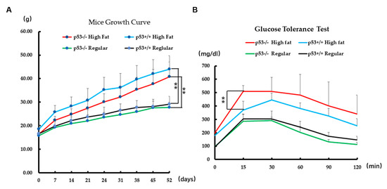 Mice (C57BL/6J) were maintained in the Animal Core Facility following procedures approved (approval number pro2012426, 10th, April, 2012) by the Animal Care and Use Committee of Albany Medical College. Five littermates of p53−/− and p53+/+ mice were chosen to receive either a high fat diet (Research Diets, Inc., Cat: D12492) or regular food (Research Diets, Inc., Cat: 12450B) after genotyping at 21 days old. Each group contained five p53−/− or p53+/+ mice that received a high fat diet or a regular diet for 52 days. An intraperitoneal glucose tolerance test (IPGTT, 1 g glucose/kg body weight) was conducted on fasted mice (for 12 h). Glucose levels were measured with the OneTouch Ultra glucometer (Lifescan Benelux, Beerse, Belgium) in 0, 15, 30, 45, 60, 90, and 120 min by tail vein puncture. The statistical significance of differences between means was assessed using Student’s t-test (** p < 0.01; * p < 0.05). Data were expressed as mean ± SE, n ≥ 3.