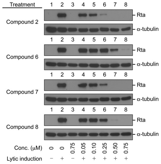 Compounds 2 and 6–28 were tested for their activity on the EBV lytic cycle. To assess this, the P3HR1 cells were treated with sodium butyrate and TPA for 24 h. As expected, lytic protein Rta was expressed after lytic induction. As a first screening, the cells were treated with protoapigenone (2), used as a positive control, or compounds 6–28 at the induction of lytic cycle for 24 h. The concentration selected for screening was 0.25 µM, where protoapigenone (2) was previously found to exert a strong activity [10]. The results indicated that three of the analogs, 6, 7, and 8 can inhibit EBV lytic cycle at this concentration. These compounds were then tested for the dose dependency of their effect on the expression of Rta; Figure 2 shows the results.