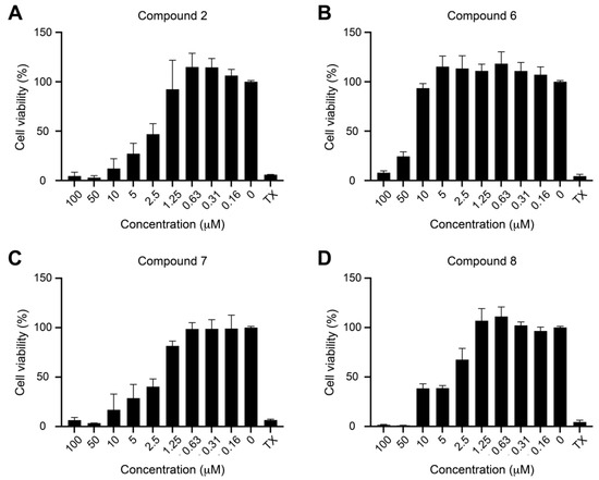 Cytotoxicity of protoapigenone (A) and its analogs (B–D) to P3HR1 cells. Cells were cultured for 24 h in a medium containing protoapigenone (2) or compounds 6–8. Cell viability was evaluated by using MTT assay. Cells treated with 1% Triton X-100 (TX) were used as a positive control. The experiment was performed twice, and each sample involved in the experiment was prepared in duplicate. Error bars represent SD. Calculated IC50 values for compounds 2, 6, 7, and 8 were 3.86, 34.12, 2.04, and 4.93 µM, respectively.