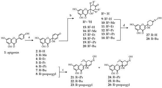 First, we prepared the 1′-O-alkyl substituted protoapigenone derivatives from apigenin (1), following our previously described procedure [7]. Oxidative dearomatization of the B-ring of apigenin was achieved by a hypervalent iodine reagent, [bis(trifluoroacetoxy)iodo]benzene, and the solvent was 10% v/v of water or alcohol in acetonitrile depending on the substituent to be coupled at C-1′. This allowed for us to obtain compounds 2–8 as potential intermediates for further transformations, among which 6 was already a compound of interest for this study due to its very weak cytotoxicity when compared to the others.
