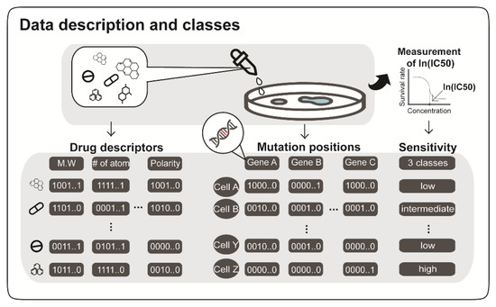 To date, drug response prediction, by integrating cell line genomics profiles (somatic mutations or transcriptomics), and drug features (drug molecular descriptors/fingerprints), has not been attempted, using ML algorithms. Recently however, a deep neural network, cancer drug response profile scan (CDRScan) was created, using cell line genomics profiles and drug molecular properties for input [17]. Even so, this approach considered binary classification accuracy (i.e., either low or high drug responsiveness) for drug responsiveness, and binary classification is not ideal.