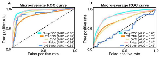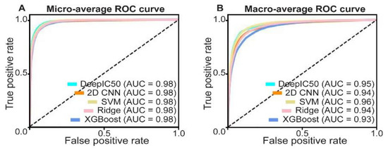Performance of DeepIC50, 2D CNN, SVM, ridge classifier, and XGBoost in the Cancer Cell Line Encyclopedia (CCLE) dataset. Micro-average (A) and macro-average (B) AUCs were, along with ROC curves, represented for the five models.