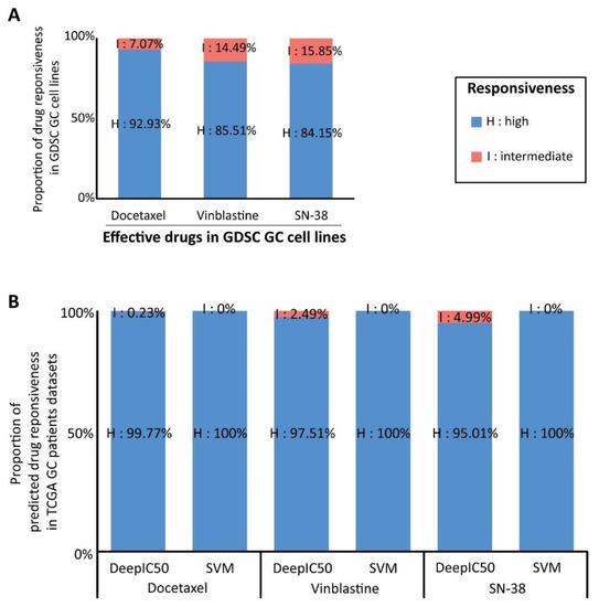 Looking into the GC cell lines and their drugs in the GDSC dataset, three potent drugs (docetaxel, vinblastine, and SN-38) were selected (Figure 5A). These drugs indicated “high responsiveness” in the majority of the GC cell lines in the GDSC dataset. These drugs also showed “intermediate responsiveness” in the minority of the cell lines (Figure 5A). It was expected that these potent drugs showed similarity in the GC patients: the majority of the patients were predicted to “high responsiveness”, but the minority of the patients should be predicted to the other responsiveness classes (intermediate and low responsiveness). The expectation is reasonable, considering heterogeneity of GC patients and cell lines [28,31] confers the different responsiveness. The expectation was observed in DeepIC50 responsiveness predictions on the GC patients (Figure 5B). However, SVM did not show the pattern like DeepIC50, and predicted all the patients to “high responsiveness” without exception. Thus, DeepIC50 over SVM was more realistic in patient drug response prediction. In another CNN model, 2D CNN, the expectation was observed, while the expectation not observed in the other traditional models (ridge, XGBoost; Supplementary Figure S3).