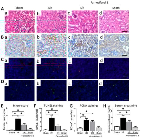 The overall effect of Farnesiferol B on kidney injury was first explored by histological assessment and creatinine quantification. Haemotoxylin and Eosin (HE) staining and kidney injury marker Kim-1 (kidney injury molecule-1) immunohistochemical staining analysis results show that I/R kidneys are characterized by tubular basal membrane rupture, nuclear infiltration, tubular vacuolization, higher Kim-1 expression, and a higher renal tubular injury score (Figure 1A,B,E). Levels of proximal tubular cell death and cell proliferation were assessed. In the TUNEL assay, the nuclei of TUNEL-positive cells were stained red (Figure 1C), and the levels of cell death were indicated as the percentage of TUNEL-positive cells (Figure 1F). TUNEL-positive cells were observed mainly in the tubular area of the renal cortex. I/R group displayed more TUNEL-positive cells that the sham group (Figure 1C(b) vs. (a)). PCNA expression was observed in proliferating cell nuclei, and was significantly increased in AKI compared with the sham group (Figure 1D,G). Serum creatinine levels in I/R mice were significantly elevated in comparison to sham-operated mice (Figure 1H). The treatment with Farnesiferol B prior to I/R decreased serum creatinine level, attenuating the I/R-induced kidney injury (Figure 1A,C,H). However, Farnesiferol B treatment did not change the I/R-induced cell proliferation (Figure 1D(c) vs. (b)). The above results suggest that, in general, Farnesiferol B treatment protects against the kidney damage caused by I/R.