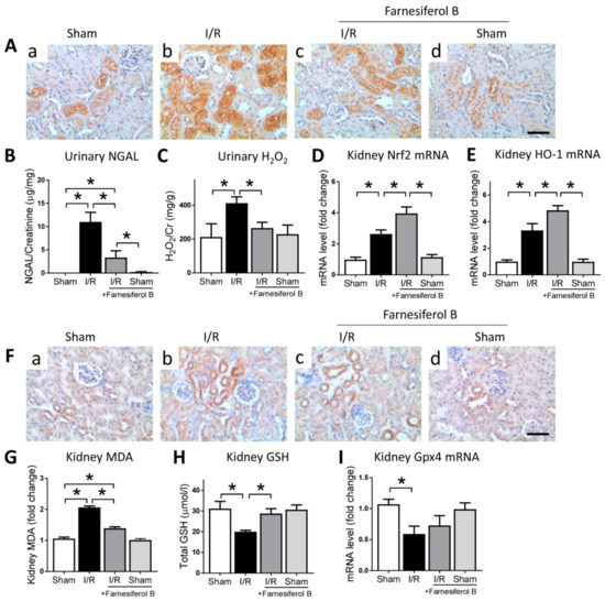 Farnesiferol B reduces oxidative stress in ischemia/reperfusion (I/R) kidney. (A) Representative images of immunostaining for NGAL on renal sections from (a) sham, (b) I/R, (c) I/R + Farnesiferol B and (d) sham + Farnesiferol B groups (scale bar 50 μm). (B) urinary neutrophil gelatinase-associated lipocalin (NGAL), (C) urinary H2O2, and kidney mRNA levels of (D) Nrf2 and (E) HO-1 were analyzed. n = 6 mice/group. Data are means ± SD, one-way ANOVA with Bonferroni’s test. * p < 0.05. (F) Representative images of immunostaining for 4-HNE on renal sections from (a) sham, (b) I/R, (c) I/R + Farnesiferol B and (d) sham + Farnesiferol B groups (scale bar 50 μm). (G) kidney malondialdehyde (MDA), (H) kidney GSH, and kidney mRNA levels of (I) Gpx4 were analyzed. n = 6 mice/group. Data are means ± SD, one-way ANOVA with Bonferroni’s test. * p < 0.05.