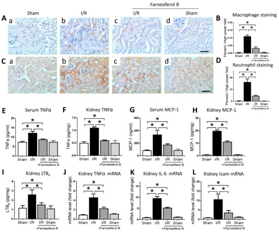 The other oxidative stress-producer is the inflammatory cell such as monocytes and macrophages, which infiltrate into tissue, especially during acute inflammation [27]. Next, we analyzed the degree of kidney inflammation. I/R increased the positive stainings of macrophages and neutrophils in the kidney (Figure 3A–D). I/R also induced levels of TNFα and MCP-1 in mouse serum and kidney, as well as the proinflammatory mediator LTB4 in the kidney (Figure 3E–I). The number of macrophages and neutrophils, as well as the serum and kidney levels of TNFα, MCP-1, and LTB4 were significantly reduced by Farnesiferol B treatment (Figure 3E–I). Inflammation-related genes expressed in the kidney were also measured. Quantitative analysis showed that I/R stimulated the expression of kidney TNFα, IL-6, and Icam mRNA levels, while levels of these mRNA decreased under treatment with Farnesiferol B (Figure 3J–L). The evidence presented here suggests a positive role of Farnesiferol B in attenuating renal inflammation.