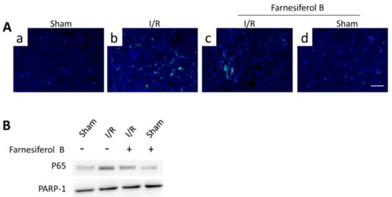 Farnesiferol B inhibits NF-κB signaling pathway in I/R kidney. (A) Representative images showing immunostaining of p65 on renal sections from (a) sham, (b) I/R, (c) I/R + Farnesiferol B and (d) sham + Farnesiferol B groups (scale bar 50 μm). (B) Representative immunoblotting image of nuclear protein for NF-κB p65 expression in kidney tissue. PARP-1 protein is used as the loading control.