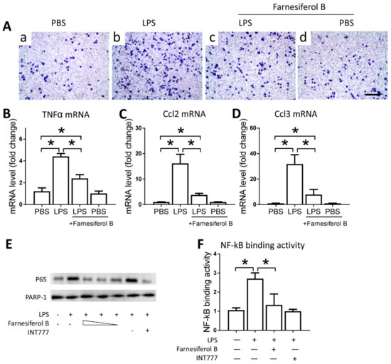 To examine the direct effect of Farnesiferol B on macrophages, we conducted in vitro experiments using the J774 cell line. J774 macrophages were treated with LPS and/or Farnesiferol B and migration ability in a transwell system was monitored as a proxy for infiltration capability. Representative images show that migration induced by LPS was abolished by co-incubation with Farnesiferol B (Figure 5A). LPS-induced migration was associated with higher mRNA expression levels of TNFα, Ccl2, Ccl3 in macrophages, compared with that from the untreated cells. Treatment with Farnesiferol B lowered mRNA expression of these inflammatory cytokines significantly (Figure 5B–D).