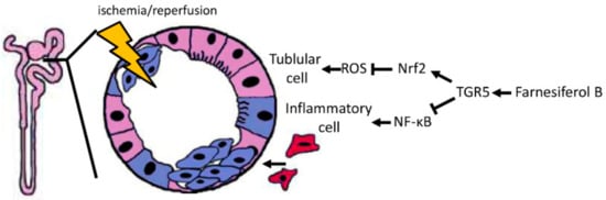 TGR5 is expressed in several types of cells, including hepatic non-parenchymal cells [18,19,20]. The renal tubular cells, and immune cells including monocytes and macrophages [21,22]. Recently, it was demonstrated that TGR5 activation could be exploited to confer protection from diabetic nephropathy [23]. Considering that TGR5 activation possesses anti-oxidant and anti-inflammatory roles [23,24] in the kidney, we hypothesized that Farnesiferol B would alleviate renal I/R injury by reducing inflammation and ROS through regulating renal tubular cells and macrophages over TGR5.