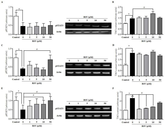 Impact of resveratrol (RSV) on leptin signalling in human hepatoma (HepG2) cells. pSTAT3 activation and triglyceride (TAG) content were determined in palmitate (Palm)-induced steatotic HepG2 cells treated with RSV for (A) and (B) 20 min, (C) and (D) 6 h, and (E) and (F) 24 h. Leptin signalling was activated by the addition of 10 ng/mL leptin during the last 20 min of incubation. * indicates p < 0.05 when comparing the 0 µM RSV group to the control group and # indicates p < 0.05 when comparing 1, 5, 10 or 50 µM RSV groups to the 0 µM RSV group as assessed by Student’s t-test. Data are expressed as the mean ± SD of three replicates. A representative WB image for each RSV incubation time is also included.