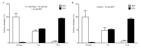 Metabolization of RSV in HepG2 cells. The graphic shows the conversion of 10 μM RSV to RSV-3-sulfate (R3S) in (A) steatotic cells and (B) control cells treated for different time periods. Cell media supernatants were collected and analysed by ultra-high-performance liquid chromatography–mass spectrometry (UHPLC-MSn) to determine the stability and cellular metabolism of RSV in cell culture. Data are expressed as the mean ± SD of three replicates.