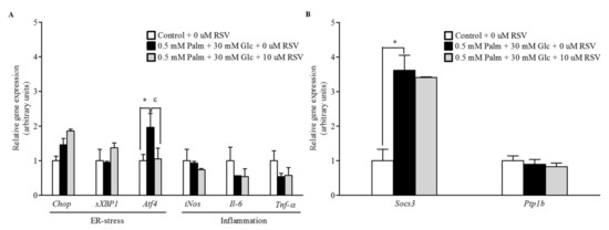 Mechanisms of action of RSV in enhancing the response to leptin (I). Steatotic HepG2 cells were treated with 10 μM RSV for 24 h. Leptin signalling was activated by the addition of 10 ng/mL leptin during the last 20 min of incubation. mRNA gene expression of (A) endoplasmic reticulum (ER) stress and inflammation markers and (B) inhibitors of the leptin signalling pathway were assessed by qPCR. * p < 0.05 comparing the Palm + Glc group to the control group and ε p < 0.1 comparing the RSV group to the Palm + Glc group as assessed by Student’s t-test. Data are expressed as the mean ± SD of three replicates. Legend: Chop, DNA damage inducible transcript 3; sXbp1, spliced x-box binding protein 1; Atf4, activating transcription factor 4; Il-6, interleukin-6; iNos, inducible nitric oxide synthase, Socs3, suppressor of cytokine signalling 3; Ptp1b, tyrosine-protein phosphatase non-receptor type 1; Tnf-α, tumour necrosis factor alpha.