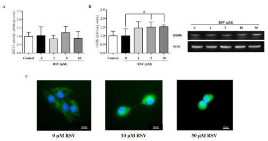 Mechanisms of action of RSV in enhancing the response to leptin (II). (A) Sirtuin-1 (SIRT1) enzyme activity and (B) hepatic longest receptor isoform of leptin (OBRb) protein content as assessed using WB. A representative WB image for each RSV incubation time is included. (C) shows a representative immunofluorescent image showing the OBRb content (green) of HepG2 cells treated with 0, 10, and 50 μM RSV for 24 h. # p < 0.05 when comparing the RSV groups to the Palm + Glc group as assessed by Student’s t-test. Data are expressed as the mean ± SD of three replicates.