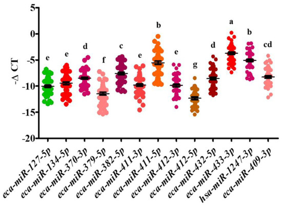 Within the remaining differentially expressed miRNAs, expression of eca-miR-127-5p and eca-miR-411-3p was significantly higher in serum at 25 d compared to 4 mo, as illustrated in Figure 3. Moreover, eca-miR-127-5p, eca-miR-370-3p, and eca-miR-412-3p were significantly upregulated in serum at 45 d GA compared to 4 mo GA (Figure 3).