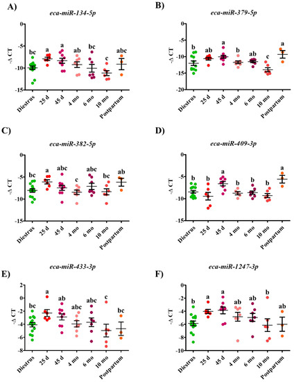 Differential expression profile of eca-miR-134-5p (A), eca-miR-379-5p (B), eca-miR-382-5p (C), eca-mir-409-3p (D), eca-miR-433-3p (E) and eca-miR-1247-3p (F) during diestrus, gestation (25 d, 45 d, 4 mo, 6 mo and 10 mo) and postpartum period in mares’ circulation. Expression of each microRNA was normalized to the geometric mean of eca-miR-10a, eca-miR-21, and eca-Let-7a, expressed as -ΔCT. Data are presented as a dot plot and the middle horizontal line represents the mean while error bars represent the standard error of the mean (SEM). Significantly different time-points are indicated by varying superscripts.