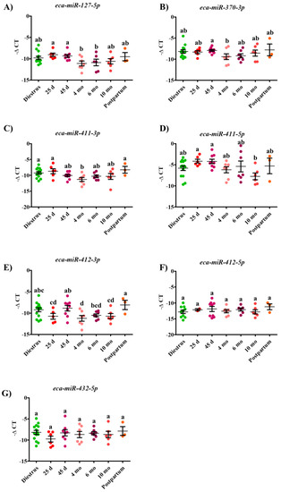 Differential expression profile of eca-miR-127-3p (A), eca-miR-370-3p (B), eca-miR-411-3p (C), eca-miR-411-5p (D), eca-miR-412-3p (E), eca-miR-412-5p (F) and eca-miR-432-5p (G) during diestrus, gestation (25 d, 45 d, 4 mo, 6 mo, and 10 mo) and postpartum period in mares circulation. Expression of each microRNA was analyzed using RT-qPCR and normalized to the geometric mean of eca-miR-10a, eca-miR-21, and eca-Let-7a, expressed as -ΔCT. Data are presented as a dot plot and the middle horizontal line represents the mean while error bars represent the standard error of the mean (SEM). Significantly different time-points are indicated by varying superscripts.