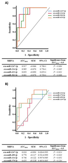 Delta CT (ΔCT) values for serum samples were calculated where ΔCT = (the CT values of the miRNA of interest—the CT values of all three reference miRNAs [geometric mean]) [57,58]. Results are presented as −ΔCT (negative ΔCT is more intuitive than ΔCT). The expressions of C24MC-associated miRNAs were compared across GA, postpartum and with samples from non-pregnant mares using one-way analysis of variance (one-way ANOVA) followed by a pairwise comparison of means using T-test. Significance was set at p < 0.05. Pearson’s correlation was performed to analyze the relationship between the expression profile of all the tested miRNAs. Receiver operating characteristic (ROC) curve analysis was carried out to assess the accuracy of eca-miR-1247-3p, eca-miR-134-5p, eca-miR-382-5p, and eca-miR-433-3p (differentially expressed miRNAs at 25 d) in differentiating pregnant (25 d) from non-pregnant (diestrus) mares. Moreover, ROC curve analysis was carried out to assess the accuracy of eca-miR-1247-3p, eca-miR-134-5p, eca-miR-409-3p, and eca-miR-379-5p (differentially expressed miRNAs at 45 d) in distinguishing pregnant (45 d) from non-pregnant (diestrus) mares. The area under the ROC curve (AUCROC) was estimated and used to evaluate the accuracy of the tested miRNAs [59,60]. In brief, the AUCROC was inferred as noninformative (AUCROC ≤ 0.5), poorly accurate (0.5 < AUCROC ≤ 0.7), moderately accurate (0.7 < AUCROC ≤ 0.9), highly accurate (0.9 < AUCROC < 1), or perfect (AUCROC = 1) [61]. The AUCROC for each parameter was compared with the expected value (AUCROC = 0.5) under the null hypothesis of a noninformative test.