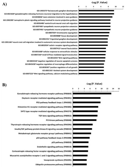Computational target prediction for miRNAs was performed to identify putative mRNA targets. A total of 428 target mRNAs were predicted using mirDB.org and IPA for the differentially expressed miRNAs (eca-miR-134-5p, eca-miR-1247-3p, eca-miR-382-5p, eca-miR-409-3p, eca-miR-433-3p, and eca-miR-379-5p). GO enrichment (biological process) analysis and pathway analysis were carried out. GO analysis revealed that these miRNAs are mainly implicated in nervous system development (Figure 5A). Pathway analysis of the same set of miRNAs revealed that they are associated with the Wnt signaling pathway and oxytocin receptor mediated signaling pathway, among others (Figure 5B).