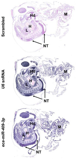 Localization of eca-miR-409-3p in the 25 d embryo and extra-embryonic membranes (25 d) by in situ hybridization (bottom image). Extra-embryonic membranes show strong, diffuse signal. Numerous embryonic tissues from the three germ layers including the developing central nervous system (neural tube) show strong signal for eca-miR-409-3p. Scrambled and U6 snRNA were used as negative and positive controls. M, extra-embryonic membranes; *, head; H, heart; NT, neural tube; L, liver. NBT/BCIP (blue) was used as the substrate. Magnification: 25×.