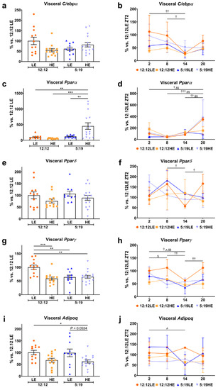 2.1. Daily Rhythms of Adipogenesis Markers are Differentially Expressed in Visceral Adipose Tissue with Changes in Photoperiod and Diet