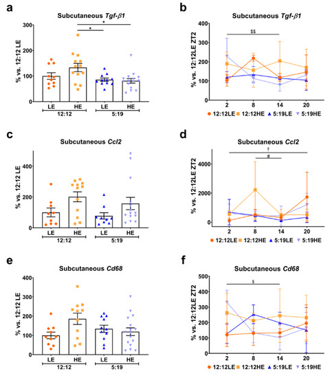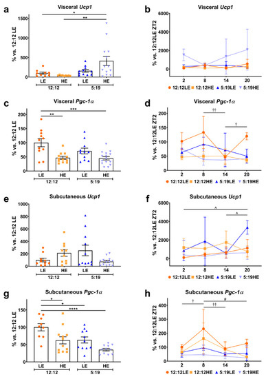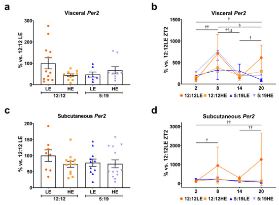 - Stenvers, D.J.; Jongejan, A.; Atiqi, S.; Vreijling, J.P.; Limonard, E.J.; Endert, E.; Baas, F.; Moerland, P.D.; Fliers, E.; Kalsbeek, A.; et al. Diurnal rhythms in the white adipose tissue transcriptome are disturbed in obese individuals with type 2 diabetes compared with lean control individuals. Diabetologia 2019, 62, 704–716. [Google Scholar] [CrossRef]