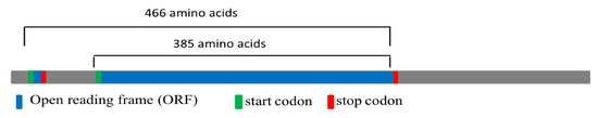 Structure of ALDH3B2 gene. Blue represents open reading frames (ORF), green represents the start codon, and red represents the stop codon. Black lines show lengths of two ALDH3B2 isoforms: the short one with 385 amino acids and the long one with 466 amino acids.
