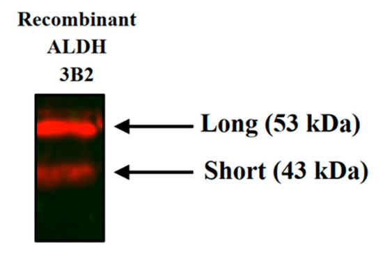 Western blot analysis using anti-ALDH3B2 antibody confirmed the expression of both short and long isoforms of recombinant ALDH3B2 protein in E. coli. Purified recombinant proteins were applied onto the polyacrylamide gel. After separation, they were transferred onto the PVDF membrane. Their immunodetection was performed using anti-ALDH3B2 antibody. The image was taken using ChemiDoc XRS+ (Bio-Rad).