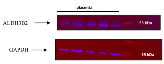 Western blot analysis of placenta homogenates using anti-ALDH3B2 and anti-GAPDH antibodies revealed bands corresponding to the molecular weight of 53 kDa (long isoform of ALDH3B2) and bands corresponding to molecular weight of 37 kDa (GAPDH). Proteins in homogenates were applied onto the polyacrylamide gel. After separation, they were transferred onto the PVDF membrane. Immunodetection of ALDH3B2 protein was performed using anti-ALDH3B2 antibody. After membrane stripping, the immunodetection was repeated with anti-GAPDH antibody. GAPDH detection was used as a loading control, as GAPDH gene is constitutively expressed at high levels in many tissues. The image was taken using ChemiDoc XRS+ (Bio-Rad). Additionally, the image of the whole membrane was added into the Supplementary Materials (Supplementary Figure S1).