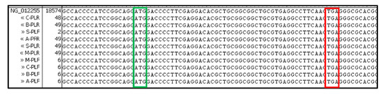 All sequences of ALDH3B2 DNA isolated from placenta samples contained premature stop codon. Sequence alignment was performed using Vector NTI AdvanceTM 11.0 software. As a reference ALDH3B2 sequence from NCBI (NG_012255.1) was used. Green frame shows first start codon and red one premature stop codon.