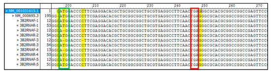 All sequences of ALDH3B2 cDNA synthesized in RT-PCR reaction using mRNA isolated from placenta samples contained premature stop codon. Sequence alignment was performed using Vector NTI AdvanceTM 11.0 software. Isolated RNA was treated with DNase to remove contaminating DNA and then subjected to RT-PCR. The obtained cDNA was sequenced. As a reference, ALDH3B2 cDNA sequences from NCBI (NM_001031615.1 and NM_000695.3) were used. The green frame shows first start codon and red frame shows the premature stop codon. Yellow indicates differences in the aligned sequences.