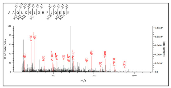 MS/MS spectrum for the tryptic peptide, AAQLQGLGHFLQENK, found in the sequence of long ALDH3B2 isoform. The upper left corner indicates the source of the fragment ions identified as either b, a, or y ions. ++ designates doubly charged fragment ions, * designates fragment ions with neutral loss.