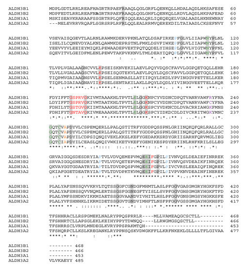 The alignment of all ALDH3 isoenzymes’ sequences, including the sequence of long ALDH3B2 isoform with alanine in the position encoded by the premature stop codon, is shown in Figure 9.
